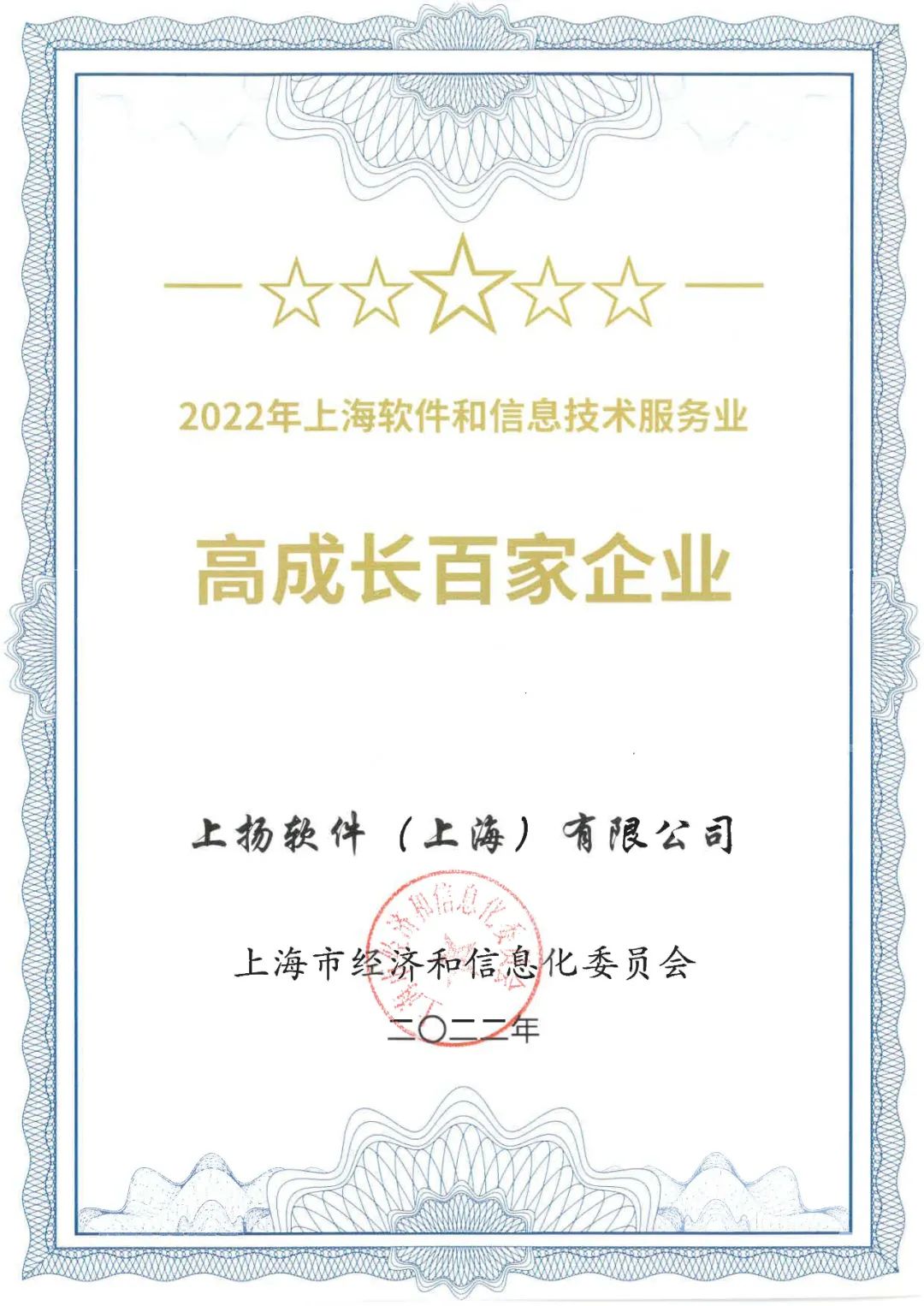 近日,上海市经济和信息化委员会根据2019-2021年度增长速度对上海软件和信息技术服务企业进行排名,评选出了“2022上海软件和信息技术服务业高成长百家”企业名单,上扬软件(上海)有限公司荣获本年度“百家”称号。